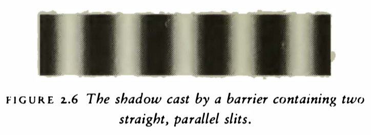 Now, what sort of shadow is cast if we cut a second, identical pair of slits in the barrier, interleaved with the existing pair, so that we have four slits at intervals of one-tenth of a millimetre? โ page 40