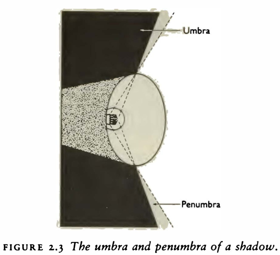is there, in principle, any limit on how sharp a shadow can be (in other words, on how narrow a penumbra can be)? For instance, if the torch were made of perfectly black (non-reflecting) material, and if one were to use smaller and smaller filaments, could one then make the penumbra narrower and narrower, without limit? โ page 36